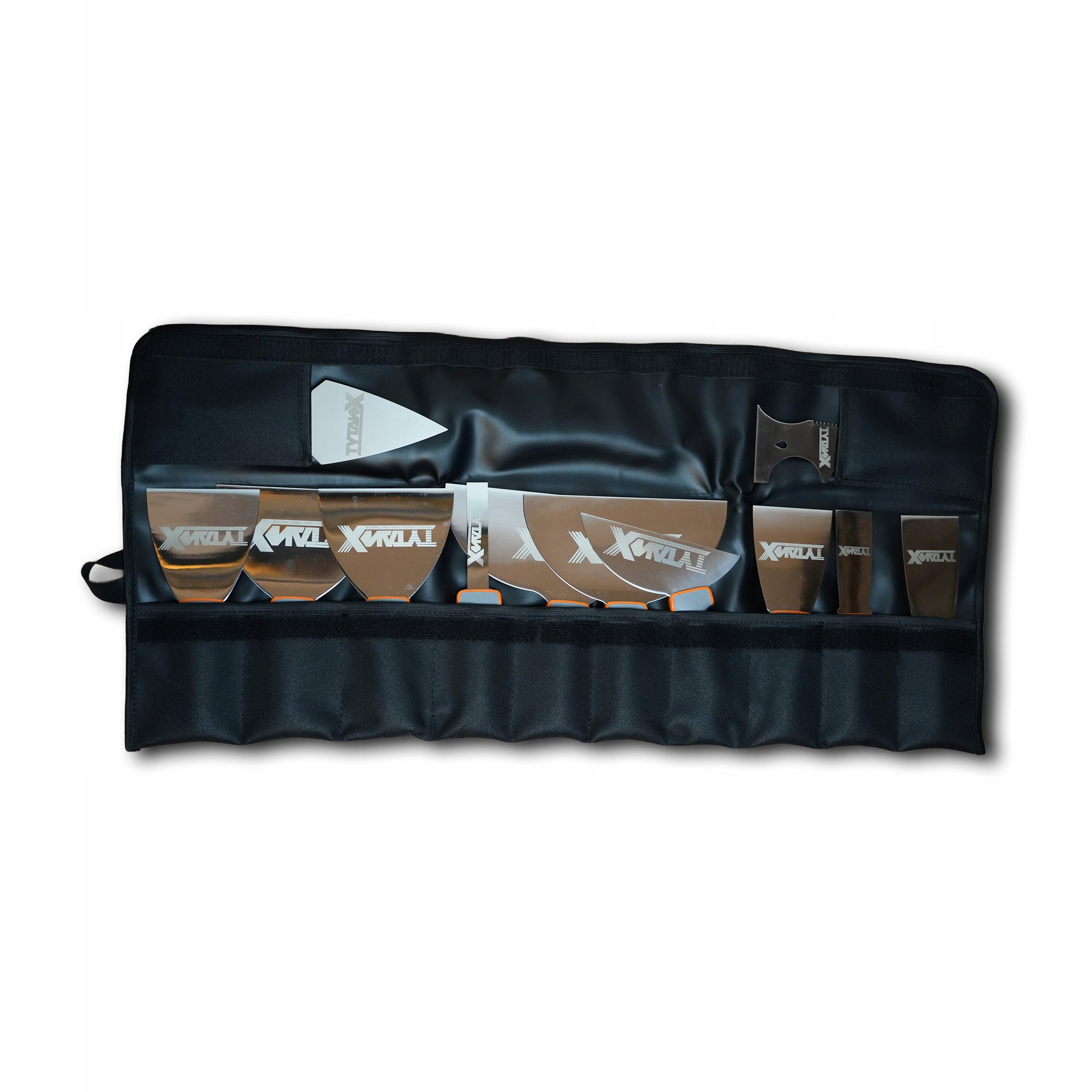 Zestaw zapakowany jest w wygodne, trwałe etui z logo TYTANX. Każda szpachelka posiada osobną kieszonkę, a po złożeniu etui zabezpieczane jest gumową opaską. Dzięki temu narzędzia są uporządkowane, bezpieczne i łatwe w transporcie.
