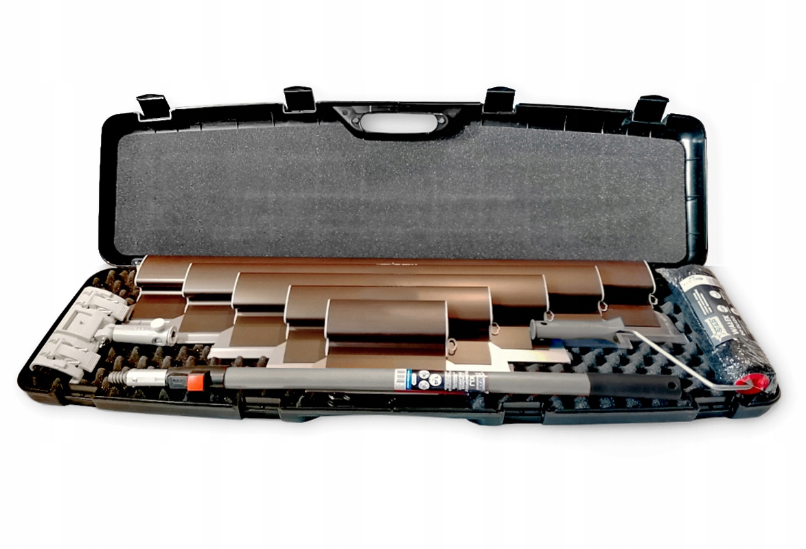 W komplecie znajduje się 5 szpachli do gładzi z aluminiowym uchwytem oraz wymiennymi ostrzami ze stali kwasoodpornej o grubości 0,3 mm i długościach od 250 do 1000 mm.Dodatkowo zestaw zawiera wytrzymałe worki na gruz 50 l BagMaster oraz szpachelkę malarską 100 mm, jak również szpachlę fasadową 250 mm. Całość zapakowana jest w praktyczną walizkę transportową.